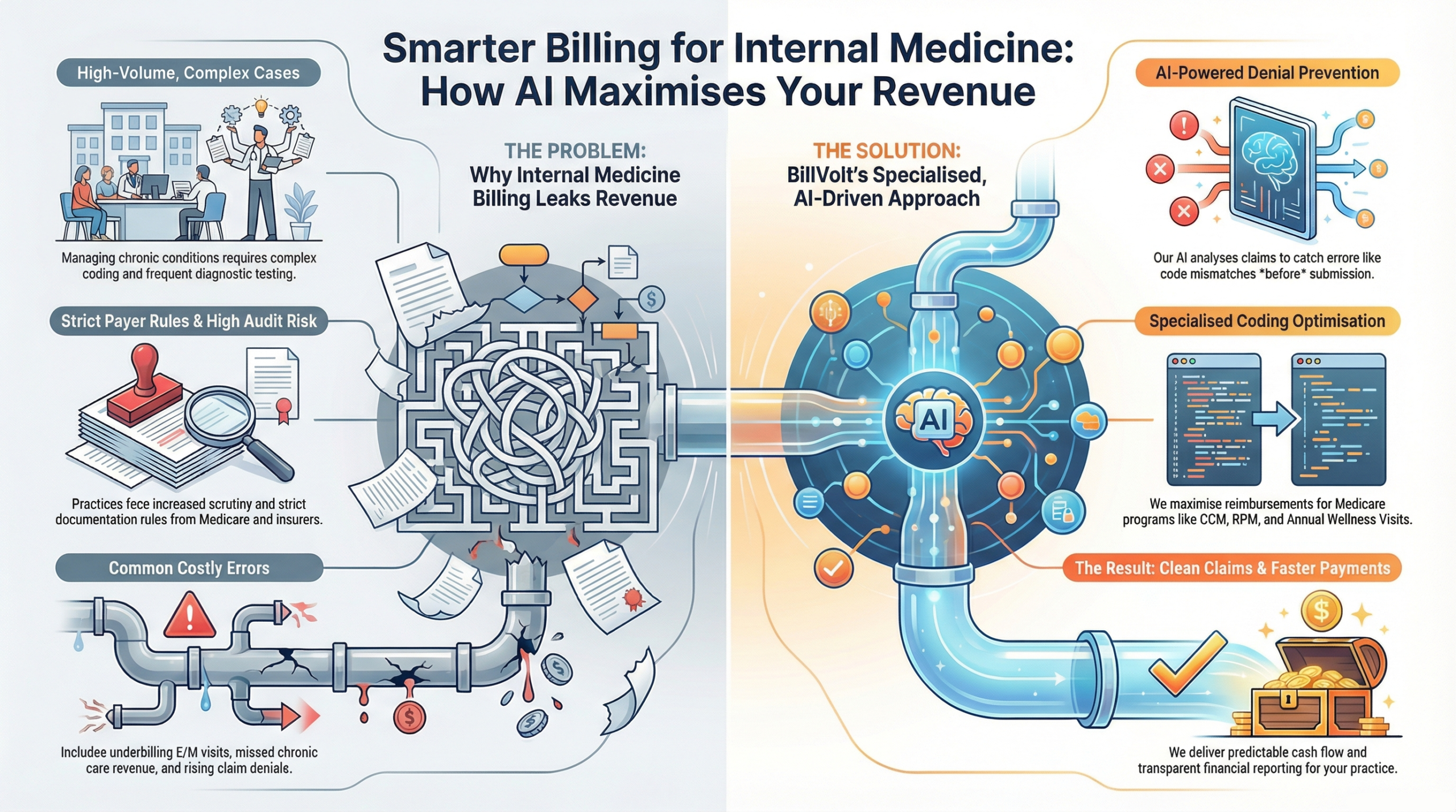 If your internal medicine practice is losing revenue to denials, undercoding, or administrative overload, BillVolt can help. Discover how AI-powered RCM can improve your financial performance without compromising compliance.